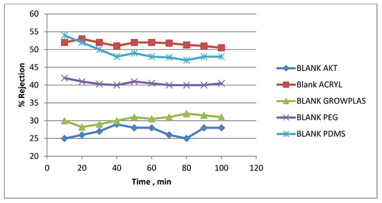The change in the chemical structure of the membrane’s top surface was found to greatly affect the efficiency of the applied surface irradiation. The 3TG membranes were prepared from 3T with the grafting and formation of polymethacrylic acid (PMAA). The effects of the different plasmas and VUV irradiation on the membrane surface changed, and their performances were evaluated and presented in Figure 6 and Figure 7. It was found that flux declined to 21 LMH for 3TG with VUV activation (AKT), which is less than the permeate flux for 3TG, and this can be attributed to more chemical interactions in the polymethacrylic layer, penetrating the TFC layer, which suddenly decreased the rejection to about 50%. The percentage rejection (Figure 7) of VUV-PEG shows a slight decrease in rejection of about 86% when compared with the 3TG without irradiation percentage of about 88%. However, it can be assumed to be the best treatment for 3TG, as the permeate flux was raised from 21 LMH (3TG) to 51.5 LMH(VUV-PEG) to almost two and half the productivity with a rejection of 86%.
