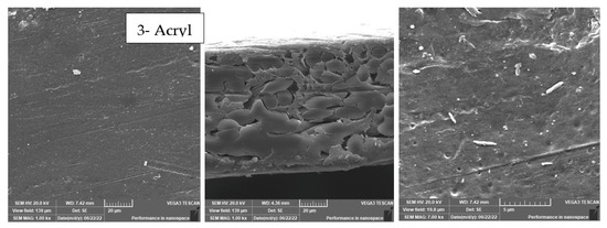However, a better compromise can be made between the increase in permeate flux with a reasonable salt rejection, as shown in Figure 9 and Figure 10, with 3P-Acryl. It was found that a reasonable increase in salt rejection to 69%, which is clear in the tight, dense structure shown in Figure 11, and with slightly increased permeate water flux from 23 to 29 LMH for 3P and 3P-Acryl, respectively.