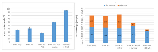 Acrylic-based plasma polymer (polyacrylic acid): The deposition of the plasma polymeric coating was performed using a plasma reactor equipped with an RF source (13.56 MHz). After a short surface activation using oxygen, the vapor of acrylic acid was fed into the plasma zone and was activated and fragmented in the plasma zone. Fragments of the acrylic acid condensated on the substrate surface (membrane) and formed a plasma polymeric coating. The plasma polymerization used argon and acrylic acid vapor as a precursor. The pressure in the vacuum chamber was 7.5 × 10−3 mbar at a power of 30 W and a deposition time of 3 min; the resulting coating had a thickness of 30 nm. The cleaning of the substrate material was performed with pure argon at 30 W power for 60 s. The acrylic acid coating was found to have hygroscopic properties.