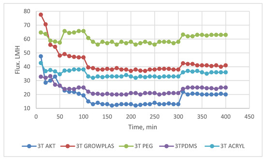 3T flux decline with permeation time for different fouling media.
