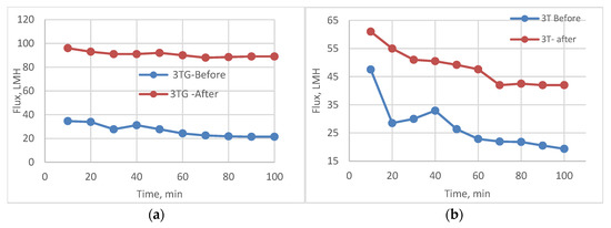 The fouled membranes were rinsed with distilled water to remove remains of fouling solution. Finally, synthetic salt water was passed through membranes again for 100 min, and the permeate flux was measured Jw2 (LMH). The flux recovery ratio (FRR) was calculated as follows (Equation (3)):