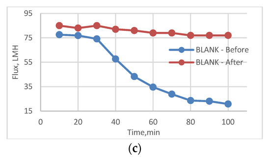 The change in flux variation before and after chlorination with plasma treatment (polyacrylic acid (acryl)) for 3TG (a), 3T (b), and blank (c).