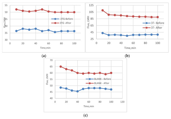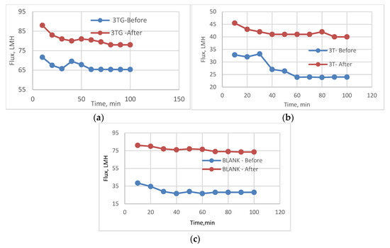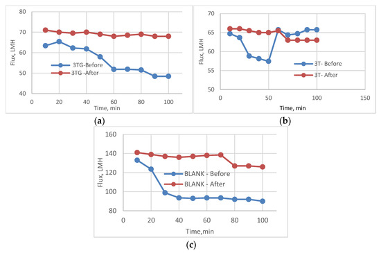 Variation of flux before and after chlorination for VUV-treated membranes(AKT) (a) 3TG, (b) 3T, and (c) blank membranes.