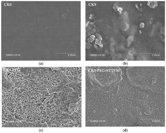 SEM pictures of the membrane surface (magnification × 15,000): (a) CK0, pristine chitosan membrane; (b) CK5, chitosan/kaolin composite membrane; (c) CK5-PEG, with PEG as a pore former; and (d) CK5-PEG-STPP30, cross-linked membranes (reaction time, 30 min).