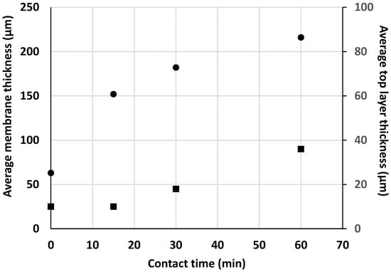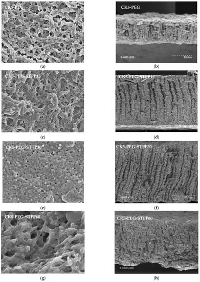 Figure 2 (right) shows micrographs of the corresponding membrane cross-sections. SEM observation revealed that the introduction of PEG into the KO/CS suspension resulted in a highly porous sponge-like structure with interconnected pores on the surface and the appearance of finger-like structures underneath. As mentioned above, similar structures characteristic of the non-solvent phase inversion method have been found for other types of composite membranes [6], and the mechanism of their formation has been explained by different authors [18,19]. Cross-linking resulted in membrane thickening without affecting the finger-like structure significantly, except in the case of the longer reaction time (CK5-PEG-STPP60). The gradual penetration of STPP and intercalation between CS chains through electrical interactions are assumed to lead to the expansion of the polymer network, resulting in thickening of the top layer and that of the membrane cross-section. Figure 3 shows the evolution of the average thickness of the composite membrane and that of the surface layer above the finger-like structure determined from the SEM images, as a function of contact time with the STPP solution.
