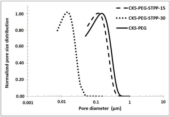 As discussed in the previous section, the surface size decreased with increasing the cross-linking time. However, it can be observed in Figure 4 that the PSD remained similar for all samples. It only shifted as the cross-linking reaction increased. The peak maximum was taken as the characteristic pore size value for the prepared composite membranes. It varied from about 160 nm for the non-cross-linked CK5-PEG membrane to about 15 nm for a membrane cross-linked for 30 min (CK5-PEG-STPP30). As mentioned before, the pore size changed little during the first 15 min of the reaction (from 160 nm to about 125 nm for CK5-PEG-STPP15), in agreement with the assumption of an induction time mainly related to the movement of the polymer chains to allow the cross-linking reaction to occur.