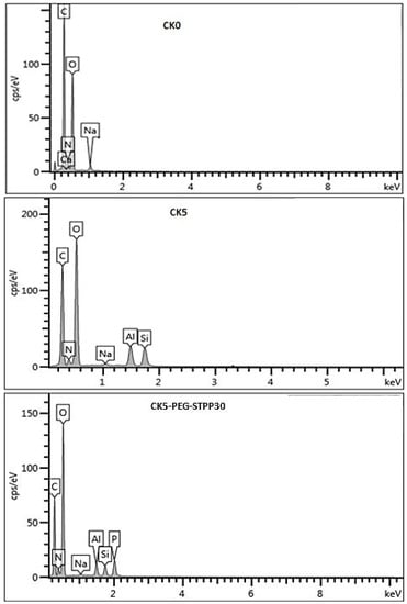 EDX microanalysis of pristine chitosan membrane (CK0), chitosan–kaolin composite membrane (CK5) and STPP cross-linked membrane (CK5-PEG-STPP30).