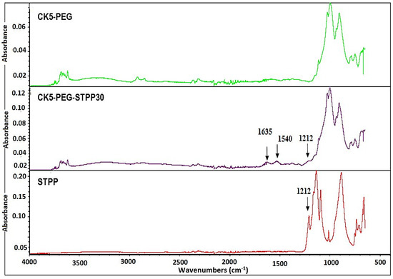 Comparison of ATR-FTIR spectra of CK5-PEG and CK5-PEG-STPP30 composite membranes and STPP powder.