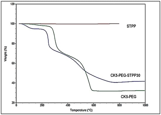 Thermograms of STPP powder, non-cross-linked CK5-PEG and 30-minute cross-linked CK5-PEG-STPP30 composite membranes.