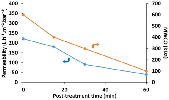 Variation in PWP and MWCO as a function of the cross-linking time.