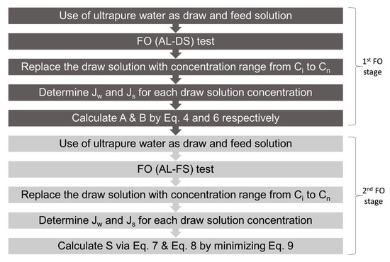 Similar procedures were then repeated for the second stage with ALFS (active layer facing feed solution) orientation. The flux values and permeability values obtained from the previous stage were applied into Equations (7) and (8). In this equation, is the bulk osmotic pressure of the draw solution, is the feed osmotic pressure, is the bulk diffusion coefficient of the DS, and is the feed solute mass transfer coefficient. The determination of the S value was achieved using A, B and S as regression parameters by opting for the lowest global error as the reference, as the global error presents the minimum deviation between estimates and experimental data, as expressed in Equation (9). Figure 2 is provided to present a clear flow of the two-stage non-pressurized process. More details of the test protocol have been thoroughly described in [20,21,23,24].