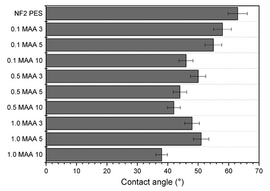 Figure 3 shows the effect of the MAA UV grafted on the NF2 PES membrane surface water contact angle. Compared to the unmodified NF2 PES membrane having an average water contact angle of 63±3 °, all UV-grafted membranes were more hydrophilic, showing a water contact angle ranging from 38°–58°. For each MAA concentration, a longer irradiation time induces a lower water contact angle, rendering the membrane surface more hydrophilic [25,26,27,28]. This result disagrees with a previous study in which the authors concluded that it was not possible to confirm whether the irradiation time affects the hydrophilic character of the membrane, provided that only two samples out of five show improvement of the water contact angle [11]. Although it was found that the hydrophilic level increases with the increase in the MAA monomer concentration, the membranes 1.0MAA3 and 1.0MAA5 had higher water contact angle values than that of the membrane 0.5MAA10, which was prepared with a lower MAA concentration but a longer irradiation time. Similar behavior was detected for the membrane 0.5MAA3 compared to the membrane 0.1MAA10. This suggests that the increase in the MAA concentration promotes a thicker grafted layer, which results in pore plugging, making it difficult for water to be absorbed; hence, this leads to a higher water contact angle compared to applying a prolonged irradiation time, owing to chain scissions that encourage pore enlargement. The membrane 1.0MAA10, grafted with the highest MAA concentration and a long irradiation time, exhibited the highest hydrophilic character compared to all other membranes. It had a water contact angle 40% smaller than that of the NF2 PES membrane.