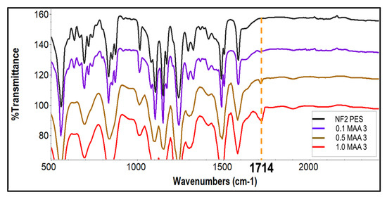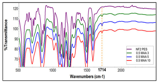 The FTIR spectra for the effect of the UV irradiation time are presented in Figure 6. A small transmittance of C=C at 1616 cm−1 for the NF2 PES membrane was observed to be gradually reduced for the modified membranes, implying that most vinyl bonds were crosslinked. The characteristic bands for COOH were spotted at 1714 cm−1 for all the modified membranes. However, it appeared that when the membrane was grafted for 10 min at a similar concentration, the intensity of the 1714 cm−1 bands was slightly reduced, indicating that less successful grafting had taken place than when the membrane was grafted for 5 min. A possible explanation for this might be that the prolonged irradiation time caused the grafted membrane to be de-grafted, and the trunk polymeric membrane deteriorated due to chain scission [12], hence reducing the intensity of the characteristic band. Full spectra and characteristic peaks for NF2 PES membrane and modified NF2 PES at different monomers concentrations and irradiation time are presented in Figure S1 (Supplementary Materials) and Figure S2 (Supplementary Materials) respectively.