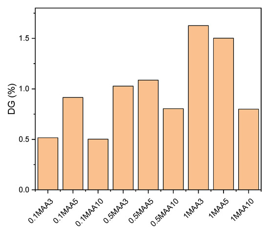 Figure 7 summarizes the results of the calculated degree of grafting (DG) of the modified membranes. It can be seen that the DG for the different sets of MAA concentrations resulted in different trends for the different irradiation times. For the lower MAA concentrations, 0.1 M and 0.5 M, the DG increased with the increase in irradiation time from 3 to 5 min, which aligned with the FTIR-ATR spectra, and it then decreased for a more prolonged irradiation time of up to 10 min. This suggests that the maximum UV irradiation time was reached, and no effective grafting took place; instead, more UV exposure started to break the monomers that had already been grafted on the NF2 PES membrane, resulting in a reduction in the DG [13]. This also explains why the membranes prepared with 1 M AA concentration experienced descending DG values when the UV−grafting time increased from 3 to 10 min. It must be emphasized that although the membranes 0.5MAA10 and 1.0MAA10 exhibited the lowest water contact angle values, their DG was not so high. Generally, the DG has a linear relationship with the water contact angle. This indicates the high roughness effect on the water contact angle measurement as a result of the overexposure of these two membranes to UV irradiation during grafting. Prolonged UV exposure may cause pore enlargement corresponding to chain scissions [32,33]. In addition, it is apparent that both the 1MAA3 and 1MAA5 membranes showed different water contact angles and DG values than the membrane 1MAA10, although the same MAA concentration was considered for UV grafting. For high monomer concentrations but limited exposure to UV irradiation, it is likely that the grafted MAA monomers partially block the pores and/or cause pore narrowing, which upsurges the reactions for homo-polymerization, resulting in an enhancement of the weight of the membrane and high DG values.