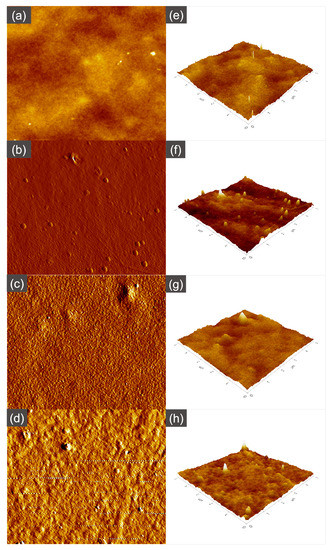 AFM images (5 µm × 5 µm) of the top surface of the NF2 PES membrane (a,e) and UV−grafted membranes 0.1 MAA3 (b,f), 0.5 MAA3 (c,g) and 1.0 MAA3 (d,h).