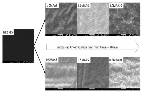Figure 10 shows the FESEM images of the cross section for the membranes NF2 PES, 0.5 MAA3, 0.5 MAA5 and 0.5 MAA10. Apparently, a new layer was developed on the PES layer for all UV−grafted membranes (b,c,d). A slight increase in the selective layer of the UV−grafted membranes prepared with 0.5 M MAA concentration was detected with the increase in the UV irradiation time from 3 to 5 min (0.142 µm and 0.430 µm, respectively) as a result of the interaction between the monomers and the PES membrane, but this thickness of the selective layer became thin with a further increase in the UV irradiation time up to 10 min. This result agrees with the obtained DG values of these membranes. Similar behaviors were reported previously in other studies [34,35].