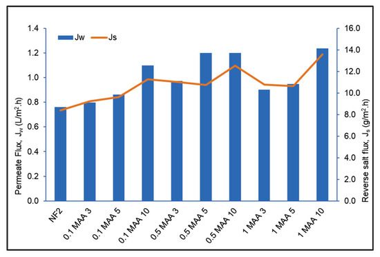 According to the previous literature [28], water flux is reduced when the MAA concentration is increased up to the optimum level. It is assumed that the number of monomers deposited on the membrane surface increases with the increase in MAA concentration, resulting in more coverage for grafting on the membrane surface, leading to a permeate flux decline. In the present work, for a higher MAA monomer concentration, the applied UV energy is unlikely to reach the membrane surface easily, promoting less MAA monomer crosslinking with the PES, and it is almost impossible for chain scission to occur. The observed enhanced Jw and Js with the increase in the MAA concentration may be due partly to deterioration of the membrane structure. This deterioration theory has been widely investigated previously in pressurized membrane processes [12,38,41].