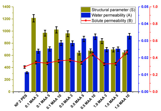 Another parameter that was successfully enhanced after membrane modification is the water permeability (A). It is obvious that the A values for all modified membranes were larger than that of the NF2 PES membrane, proving that UV grafting can improve the permeability of the membrane for the FO process. As can be seen in Figure 14, generally, the A and B values increased, whereas the S value was reduced with the enhancement of the grafting time. This trend was observed for all concentrations of MAA.