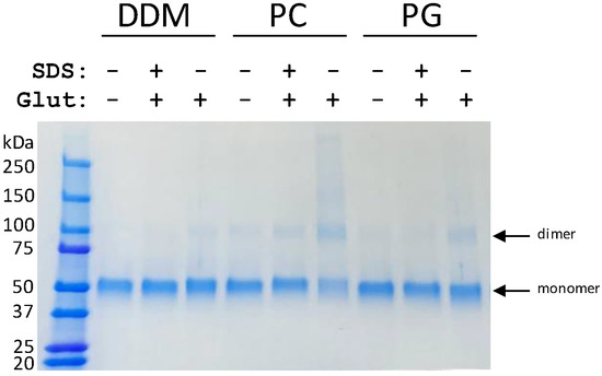 ScBor1p could be readily purified as described previously [25]. When solubilized and purified in DDM, our group and others have shown that ScBor1p is almost entirely monomeric [25,32]. However, previous studies have determined experimental structures of A. thaliana Bor1 and the yeast S. mikatae Bor1p (SmBor1p) in dimeric assemblies [3,4], and SmBor1p has 89% sequence identity to ScBor1p (Figure S1). To better understand the physical basis of ScBor1p monomer-dimer equilibrium, we prepared proteoliposomes and performed a glutaraldehyde covalent cross-linking assay that we have previously used to assess dimerization in detergent [25]. We tested phosphatidylcholine (PC) because it is the most abundant glycerophospholipid in S. cerevisiae [33], and we used phosphatidylglycerol (PG) as a control because a previous study showed that it promoted ScBor1p dimerization, despite its typical absence in yeast membranes [32]. The PC and PG preparations each contain identical mixed acyl fatty acid chains of 16:0 and 18:1, so the lipids differ only in their head group identity. Our results show that PC partially shifts the sample towards dimerization, while PG results in a more modest shift than PC (Figure 2). Controls in which SDS was added prior to the addition of glutaraldehyde demonstrate that the dimerization we observe is minimal in denaturing conditions.