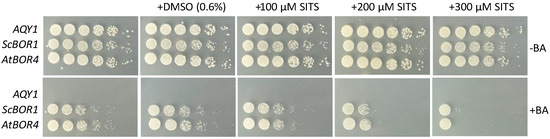 One hallmark feature of human SLC4 transporters is the inhibition of their anion transport by stilbene disulfonate-derived inhibitors [36,37]. If ScBor1p is a strong model for studying SLC4 transporters, we predict that borate transporters would be inhibited by stilbene disulfonate-derived inhibitors such as 4-acetamido-4′-isothiocyanatostilbene-2,2′-disulfonic acid (SITS). To determine whether borate transporters can be inhibited by SITS, we tested the sensitivity of ScBor1p and the A. thaliana Bor4 transporter (AtBOR4) to SITS through genetic plating assays. We chose AtBOR4 both because the sensitivity of plant borate transporters to SITS is unknown and because a prior study showed that among all seven A. thaliana borate transporters, BOR4 shows the strongest growth phenotype against boric acid in bor1 deletion cells [26]. Our results show that ScBor1p and AtBOR4 are each inhibited by SITS (Figure 3). Importantly, negative controls show that the highest SITS concentration tested has no deleterious effect on growth in plates lacking boric acid, demonstrating that SITS toxicity is specific to the cellular context in which borate transport is necessary for survival. A plating assay with 4,4′-diisothiocyanatodihydrostilbene-2,2′-disulfonic acid (H2DIDS) shows borate transporter sensitivity, though H2DIDS also shows some toxicity in non-borate testing conditions. Therefore, the effect of H2DIDS on ScBor1p is less clear (Figure S2). A previous study showed that ScBor1p could bind to a resin conjugated to SITS [38]; here we show in vivo evidence demonstrating that both ScBor1p and AtBOR4 are inhibited by SITS. Borate transporter similarities with SLC4 transporters thus include sensitivity to the same small molecule inhibitors.