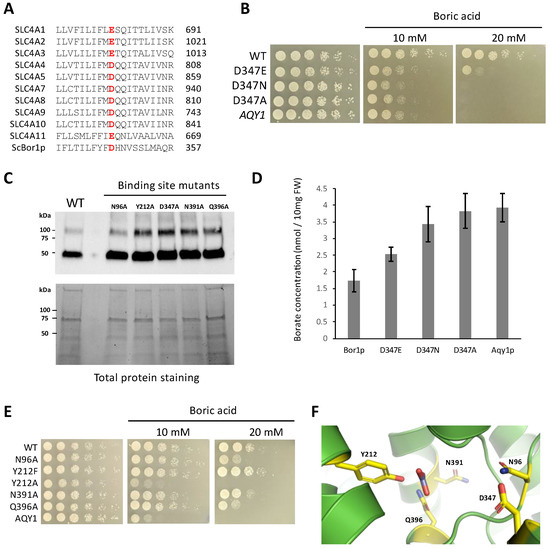 Previous studies in SLC4A1 show that the solute binding site contains a glutamate, E681 in human numbering, that is essential for function [39,40,41]. An acidic residue in this position is perfectly conserved in the SLC4 family (Figure 4A), and previous studies have suggested that the difference between the presence of a glutamate or aspartate in this position could influence whether the transporter is an anion exchanger or a sodium co-transporter, respectively [16]. In borate transporters, this position is an invariant aspartate. Previous work has shown that alanine substitutions at position D347 in ScBor1p and the homologous D311 in AtBor1 each abolish function [3,11]. To test how more conservative changes to D347 might impact function, we assayed the effect of D347E and D347N in genetic plating assays. Interestingly, we show that the D347E mutation results in a hypomorphic phenotype, while a mutation as conservative as D347N results in no growth (Figure 4B). Western blot analysis shows that the least conservative mutation, D347A, shows robust expression like the wild-type protein, and therefore a decrease in expression cannot explain the phenotype (Figure 4C). Because we previously reported that AtBOR1 supports no growth in yeast plated on media containing 20 mM boric acid but can nevertheless display borate efflux activity through assaying borate quantities in cell lysates [26], we tested whether these amino acid changes to D347 directly affected borate efflux activity by using a spectrophotometric assay for quantifying borate [28]. Our results show that the D347E mutation results in decreased but significant borate transport relative to negative controls, while the D347N mutation abolishes borate transport to levels indistinguishable from negative controls (Figure 4D). Taken together, the multiple sequence alignment, genetic data, and borate quantification data suggest a requirement for an acidic residue at this location in borate transporters and SLC4 transporters alike. That the most conservative mutation tested, D347N, results in a total loss of function suggests that D347 may be involved as a proton donor/acceptor.