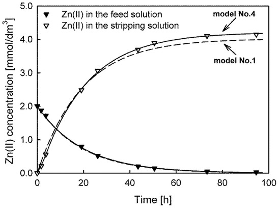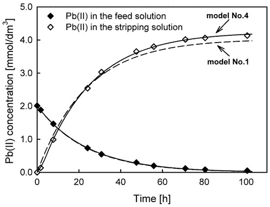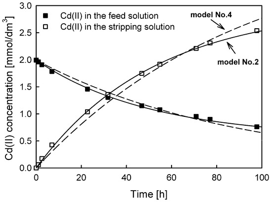 The fit of models No. 2 and No. 4 to the experimental data of Cd(II) ion transport is shown in Figure 6. The results indicate a much better fit of model No. 2. Moreover, no time lag effect was observed in the investigated system. The undetectable time lag may result primarily from the properties of the carrier used, as well as the application of the thinnest membrane in the experiments.