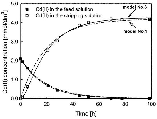 A comparison of the fits of models No. 3 and No. 1 to the experimental data for Cd(II) ion transport is shown in Figure 3.