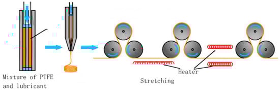 A fine e-PTFE powder is homogeneously dispersed in an oil lubricant (processing aid) to become a paste. The first step, called pre-forming, typically takes place between 21 and 25 °C and serves to align the PTFE particles for packing in the best possible way. The presence of lubricants is essential to promote rapid absorption of the mixture []. The resulting paste is pressed into a mould and ram extruded into sheets or rods that are passed several times through two heated rolling mills to obtain a precise thickness. The resulting membranes are then stretched and hardened at room temperature and sintered at 340–365 °C, maintaining the stretching condition to fix the porous structure and prevent shrinkage [] (Figure 1).