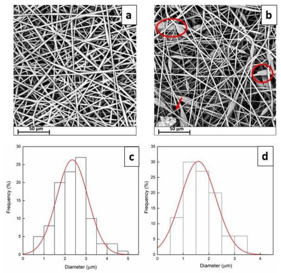 SEM images and diameter distributions of PCL/PVP (a) and Querc-PCL/PVP membranes (b). Distributions of diameters of PCL/PVP (c) and Querc-PCL/PVP (d). (red circles and arrows indicate the beads).