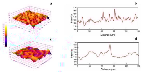 Three-dimensional surface plots of electrospun systems ((a): PCL/PVP and (c): Querc-PCL/PVP) and profile plots ((b): PCL/PVP and (d): Querc-PCL/PVP).