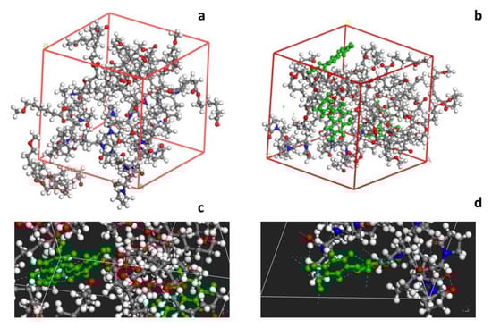 A three-dimensional cubic unit cell was constructed using the Amorphous module (Figure 4a,b). The optimized geometries of Querc-PCL/PVP exhibited hydrogen bonding interactions (cyan dotted line) between the OH group of quercetin (green molecule) and the C=O group of polymers as evident in 4c and 4s4d, which is confirmed by the Forcite module, with minimum total energy of Etot = −913 kcal mol−1.