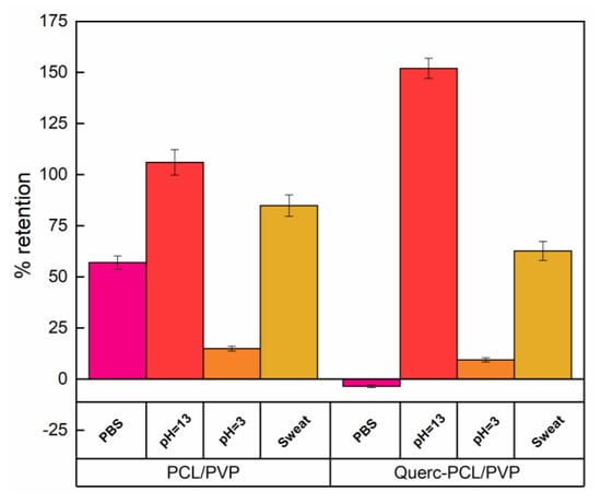 The obtained data can only be described by considering different parameters affecting the retained liquid amount such as roughness, porosity, polar surface sites and isoelectric point. Concerning the test carried out by using phosphate buffer solution, an increase of 57% in weight was observed for PCL/PVP membrane, while a negative value, representative of weight loss, was recorded for the quercetin-loaded system. This trend can be correlated to the higher porosity of PCL/PVP systems allowing water to better go through fibers. Concerning the retention of sweat simulant, a reduction of 26% was observed. In this case, the overlapping of different factors has to be considered, such as porosity, ionic strength, isoelectric point and presence of salts. The presence of salts could lead to a partial deprotonation of quercetin; a negative charge onto the surface is present leading to the formation of weak electrostatic interactions with cationic groups. It follows that the swelling of polymeric system favored the entry of water molecules. Concerning acidic medium, data indicated a relatively stable material irrespective of quercetin loading. In acidic medium, retention degrees of 15% for PCL/PVP and 9% for Querc-PCP/PVP were observed. The slight decrease in retention for the loaded membrane could be due to the reduction in porosity caused by the presence of quercetin. This effect could be associated to the fact that, as pH < pka, the neutral form of quercetin might exist and, so, the hindrance offered by quercetin molecules could limit the water diffusion inside the polymeric network. Concerning the alkali solution (pH = 13), an increase of about 43% was for Querc-PCL/PVP compared to the unloaded one. This could be due to the effect of pH on quercetin stability. The pka values for two subsequent deprotonations of OH groups of quercetin have been (pka1 ∼ 7.03 and pka2 ∼ 9.15) [41]. At about pH = 7, single deprotonated species of quercetin (i.e., monoanion) and neutral form of quercetin might coexist while as pH > pka, the double deprotonated species of quercetin (i.e., dianion) might co-exist with another two (neutral and monoanion) species of quercetin. Therefore, at high pHs, the negative quercetin forms could exercise a repulsive force which led to the swelling of the polymeric structure allowing the water for entering into it.