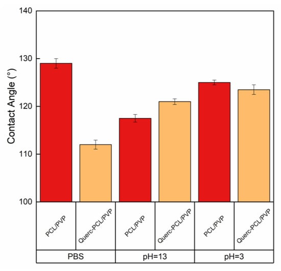 It is well known that the lower the contact angle, the higher the hydrophilic nature of the surface. The average PBS contact angle values were found to be 129° ± 1° and 112° ± 1° for PCL/PVP and Querc-PCL/PVP membranes, respectively. It is known that polyesters, such as PCL, are hydrophobic materials [42]. Therefore, this property could explain the high hydrophobicity of PCL/PVP membrane. The loaded membrane showed less hydrophobic character than the quercetin-unloaded membrane due to the presence of OH groups which could contribute to favor the spreading of liquid droplet onto the surface. In basic condition (pH = 13), the contact angle values were found to be 118° ± 1° and 121° ± 2° for PCL/PVP and Querc-PCL/PVP membranes, respectively, while in acidic condition (pH = 3), the contact angle values were found to be 125° ± 0.5° and 124° ± 0.6° for PCL/PVP and Querc-PCL/PVP membranes, respectively. Therefore, no noticeable statistical differences could be observed.