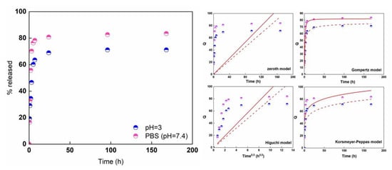 Figure 7b shows the fittings of release data over the time range (solid line refers to the release evaluated in PBS while dot line refers to the release evaluated in acidic medium at pH = 3). Evaluated parameters are listed in Table 1.