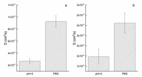 As expected by observing the release profiles, the diffusion coefficients in PBS are higher than pH = 3 solution in both cases. In particular, the D (short time) in PBS is one order of magnitude higher than pH = 3 while, for long times, the D in PBS is 1.5 time higher than pH = 3. The mobility of quercetin molecules in slightly neutral solution (pH = 7.4) might be due to the presence of anionic quercetin which, since the generation of repulsive forces, is favored to be released faster compared to acidic medium.