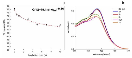 The release of quercetin from UV-irradiated samples is shown to decrease along irradiation time. It changes from 82% for no-irradiated sample up to 57% after 10 h of UV exposure. From the obtained data, it can be concluded that about 25% of quercetin was lost due to the photolytic reaction induced by UV exposure. Therefore, taking that into account, a screening effect of the microfibrous structure can exist, at certain amounts. Since the hydroxyl group on the C ring is known to be the main determinant for the photostability of quercetin [47], the drug located onto the surface can easily be degraded by UV-rays. Concerning the amount encapsulated inside the electrospun fibers, it is usually suggested that intermolecular hydrogen bonds could exist and have an effect on the protection of quercetin against UV irradiation. Therefore, energy of radiation is partially used for breaking the hydrogen bonds reducing [48]. The UV-Vis spectra of quercetin are reported in the right side as function of irradiation times. The released amount data along irradiation times have been modeled by setting a power law model as Q = Qmax(1 + tirr)b where Qmax is the maximum amount at t = 0 while the parameter b, being negative, confirms the decrease in Q released along the irradiation time (tirr).