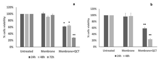 Cell viability assay. (a) MTT assay on KG1 cells after 24 h, 48 h and 72 h of treatment with membranes loaded with quercetin (direct contact); as negative control, not loaded membranes were used. (b) MTT assay on MRC5 cells after 24 h and 48 h of treatment with the conditioned medium, i.e., medium incubated for 24 h with membranes loaded with quercetin; as negative control, medium conditioned with non-loaded membrane was used. Data are reported are means ± standard errors of three independent experiments, each in triplicate and are expressed as the percentage of residual cell viability relative to the viability of untreated cells; * p < 0.05 and ** p < 0.01 versus untreated cells.