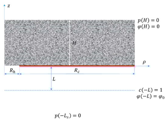 We consider a porous layer coated on one side with an IEX “mask” having rather scarce circular perforations (see Figure 1). Strictly speaking, one should specify the pattern of the perforation array and solve 3D problems for volume and ion transfer. For infinite arrays, proceeding from symmetry considerations, one can consider a single perforation while accounting for the existence of the other ones using boundary conditions formulated at the external surface of a 3D domain enclosing every single perforation. Depending on the (regular) pattern, such domains can have triangular, square or hexagonal cross-sections. Their explicit modeling would require the solution of 3D problems. To reduce 3D problems to 2D, we will use a cylindrical cell model that approximates the polygonal domain surface with a cylinder. Several studies on microelectrodes [,,] have demonstrated good accuracy of such an approach.