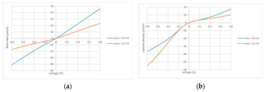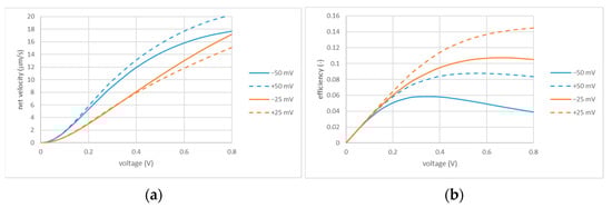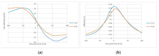 Net flow velocity (a) and efficiency (b) vs. applied voltage; and . The values of zeta potential are indicated in the legends.