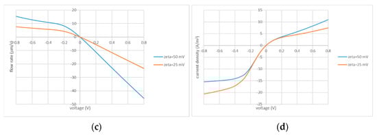 Current–voltage (b,d) and flow–voltage (a,c) characteristics: ; ; the values of the zeta potential are indicated in the legends.