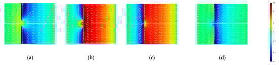 The previous study [] demonstrated that without unstirred layers (and using the Darcy law for the description of flow in the porous layer), the dependencies of flow rate on the applied voltage (including its sign) were strictly linear. The system’s non-linearity and asymmetry manifested themselves only in the current–voltage characteristics. Due to their asymmetry, the same amount of electric charge transferred in two opposite directions gave rise to the transfer of different volumes of liquid and a non-zero net volume transfer over the period. In this study, we account for unstirred layers and use the Brinkman equation (instead of the Darcy law) primarily to better capture the flow details close to the perforation edge. This gives rise to deviations from the strict linearity of flow vs. applied voltage. As one can see from Figure 2, they are not very pronounced in the case of opposite signs of fixed charges in the porous and IEX layers. On the contrary, the current–voltage characteristics in this case are pronouncedly asymmetrical. Therefore, the net flows are controlled by the current asymmetry as described above. In the case of coincident signs of fixed charges, the situation is more complex, namely, both the flow and current feature considerable asymmetry, while the current asymmetry is less pronounced than in the case of opposite signs. However, both asymmetries work in the same direction given that the currents are larger in magnitude at negative voltages where the flow rates are smaller. Below, we will see that in many cases, this gives rise to somewhat larger net flows and efficiencies (see below for the definitions) than in the case of charges of opposite signs, although this ultimately depends on the system parameters. Overall, both configurations feature comparable performances.