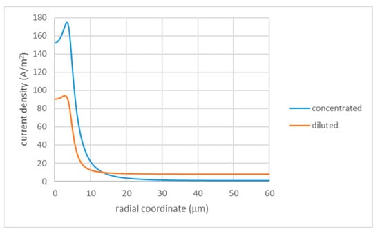 Radial distribution of current density in configurations with solution injection: ; ; (injection of a more concentrated solution); (injection of a more diluted solution). The legend indicates the condition of injected solution.
