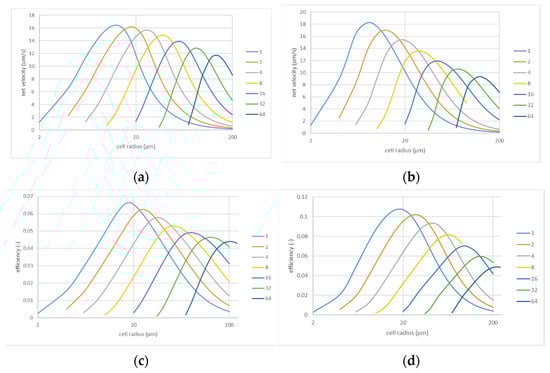 Net flow velocity and efficiency vs. cell radius for various perforation sizes: ; (a,c) and (b,d). The legends indicate the perforation radii (in µm); note that .