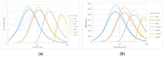 Net flow velocity (a) and efficiency (b) vs. cell radius for various perforation sizes: ; the legends indicate zeta potentials (in mV) and perforation radii (in µm). Note that the solid lines show the case of opposite signs of fixed charges and the dashed lines show the case of coincident signs.