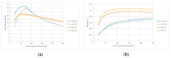 Net flow velocity (a) and efficiency (b) vs. porous layer thickness; the legends indicate zeta potential (mV); imperfection radius (µm); and cell radius (µm).