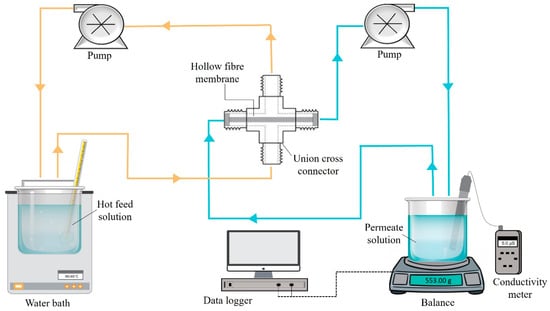 Direct contact membrane distillation (DCMD) process was carried out to evaluate the desalination performance of fabricated membranes, using the installation schematically shown in Figure 2. The membrane was placed in a stainless steel union cross connector and the outer surface of the membrane was positioned in contact with the hot feed side and the temperature was fixed at 60 °C. Meanwhile, the temperature was maintained at room temperature for the permeate side. The permeation flow rate was set for 150 mL/min at 1 atm. The hot feed solution was pumped into the module’s shell side, and the permeate flow from the distillate was collected from the lumen side of the hollow fibre. The DCMD process required 8 h for desalinating 40,000 ppm (500 mL) of NaCl solution. The weight changes in the permeate solution were monitored using weighing balances connected to the data logger. The pure water permeation flux (JW) was determined using Equation (2):