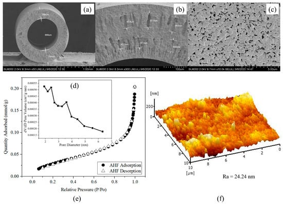 FESEM micrographs of AHF (a) cross-section, (b) enlarged cross-section, and (c) outer surface; (d) BJH porosity; (e) N2 adsorption–desorption isotherm; and (f) AFM image.