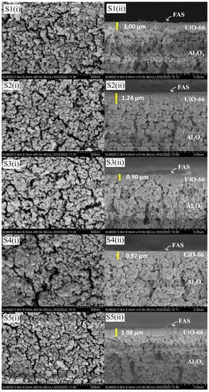 The microstructure of AHF membranes for all samples is shown in Figure 3. Based on these images for membranes S1–S5 (Figure 4), the average particle size of UiO-66 obtained on the top of AHF ranged from 50 to 60 nm. Compared to the standard size of UiO-66 particles (200–500 nm) synthesised by hydrothermal [,,], a smaller size of particles was obtained in this study. This shows that the pre-seeding treatment of ZrO2 using the sol–gel Pechini method enables a reduction in UiO-66 particle size. A small number of metal nodes (Zr4+) were pre-attached to the membrane substrate before the fully metal nodes were introduced during the hydrothermal process. This unique strategy was studied by Lan et al. in preparing ZIF-8 []. They determined that the separating process of nucleation and growth could control the crystal size formation. The crystal size of ZIF-8 was reduced from 440 nm to 45 nm by changing the amount of metal node during pre-seeding treatment. Moreover, turning the MOFs particle to smaller size produces a high surface area/volume ratio, which increases the outer surface energy of the particles []. Meanwhile, a layer of UiO-66 can be observed from the cross-section image with a thickness ranging from 0.90 to 1.24 µm. However, after FAS were grafted on the surface, there was no substantial layer could be observed by FESEM images. Previous studies have demonstrated that after a grafting process, FAS layer was barely visible when FAS with 0.01 mol/L in hexane [] and 2 wt% in ethanol was used []. For the UiO-66-untreated membranes (Figure 5), the AHF grains were clearly observed (image comparison to Figure 3c), in which a similar condition was obtained. The FAS was not revealed by a distinct layer on the AHF surface. Owing to the limited number of hydroxyl groups on the surface of sintered AHF, it is evident that the FAS molecules were only bound to the surface and did not polymerise to form an obvious layer that could be observed by morphological analysis []. However, the spectra generated by EDX analysis consist of peaks showing the composition of Si and F elements (Figure S1).