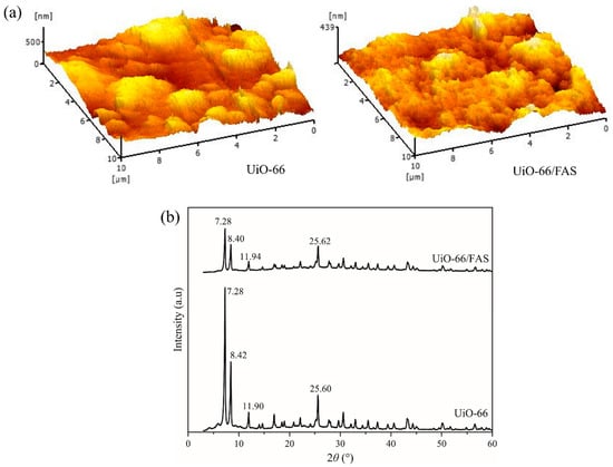 (a) AFM image, (b) XRD diffractogram of UiO-66 and UiO-66/FAS.