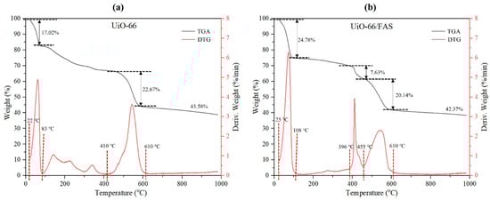 TGA was carried out to determine the thermal stability of the prepared samples. The TGA–DTG curves of UiO-66 and UiO-66/FAS are presented in Figure 8. The first weight loss appearing at 22–83 °C for UiO-66 and 25–108 °C for UiO-66/FAS was due to the desorption of water at the surface of the samples. For the second stage, a small weight loss of UiO-66 appeared at the temperature of 129 °C, representing unreacted acetic acid, meanwhile that which appeared at the 220 °C originated from residual DMF solvent. Moreover, the weight loss that appeared at the temperature 329 °C was assigned to the dehydration of the OH terminal from Zr6O4(OH)4 nodes to Zr6O6 []. Meanwhile, there was no obvious solvent weight loss in the UiO-66/FAS sample at the same temperature range caused by the FAS that was coated on the UiO-66 frameworks. The desorption of solvent molecules from frameworks is lesser due to the heating process that took place during FAS grafting. Then, the TGA curve of UiO-66 declines at approximately 410–610 °C with a weight loss of 22.67%, and at 455–610 °C with a weight loss of 20.14% for UiO-66/FAS, suggesting the decomposition of the organic linker in the frameworks []. The significant decline at 396–455 °C in UiO-66/FAS was attributed to the loss of fluoroalkyl chains of FAS molecules. After 610 °C, both materials showed a residue of 43.58% and 42.3% for UiO-66 and UiO-66/FAS, respectively, which were assigned to the remaining ZrO2.
